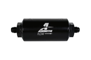 AN-06, 100 micron stainless steel element, black anodize finish An inexpensive insurance policy to protect your investment, proper filtration is key to fuel system performance. Engineered filter solutions are required to achieve protection with minimum restriction. For 200 ? 3,000 plus HP applications, our filter assemblies offer unmatched flow, ease of installation and maintenance, along with the impeccable machining and finish you?ve come to expect from all Aeromotive components. High-flow, 100-micron stainless mesh replaceable element. Flows 2,000 lb/hr with a pressure drop of less than 1 PSI. Male AN-06. All filter assemblies feature an O-ring for positive sealing in high pressure applications. CNC-machined from 6061-T6 aircraft aluminum. Bright dip black anodized finish for a corrosion resistant, show car quality appearance.